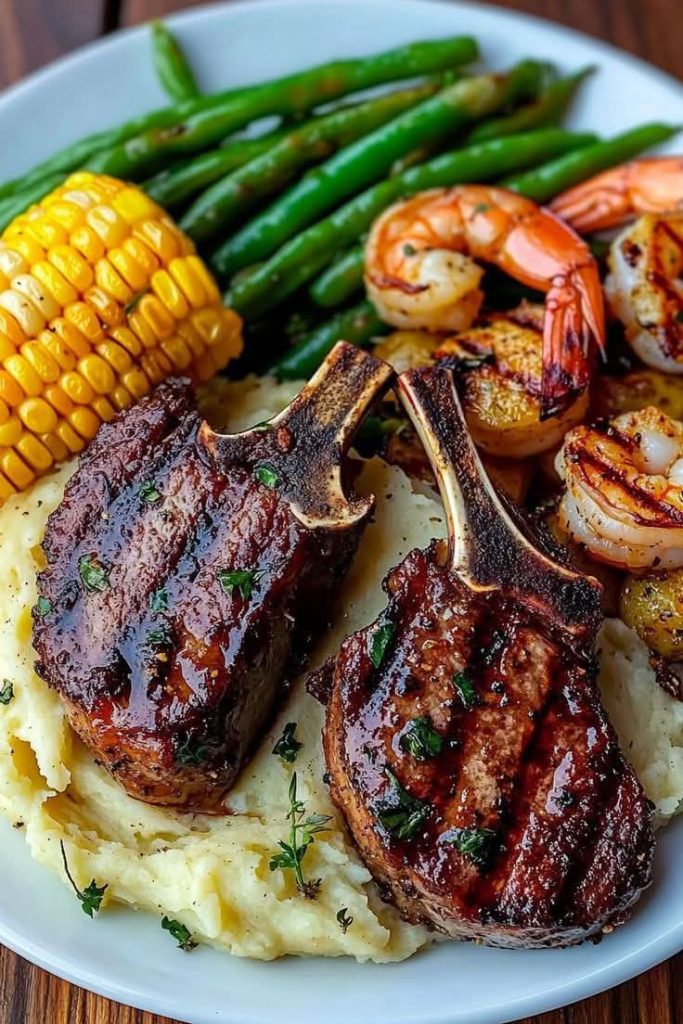 There’s nothing quite like a hearty plate of grilled lamb chops served over smooth, buttery mashed potatoes — surrounded by golden corn on the cob, tender green beans, and flavorful shrimp. This dish brings the comfort of a home-cooked meal together with the elegance of a restaurant plate. Each bite bursts with flavor — smoky, savory, creamy, and fresh all at once.