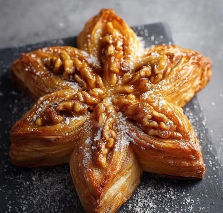 Buttery, golden layers filled with sticky maple sweetness and toasted walnuts — this puff pastry star is as stunning as it is delicious. Imagine pecan pie meeting flaky pastry for a winter waltz of cozy flavor. Perfect for holiday brunches, dessert tables, or a show-stopping centerpiece!