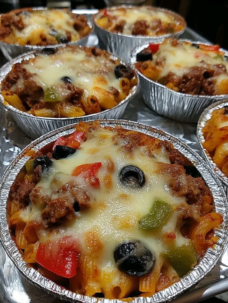 Repeat layers — sauce, meat, toppings, and more cheese — until bowls are nearly full.
