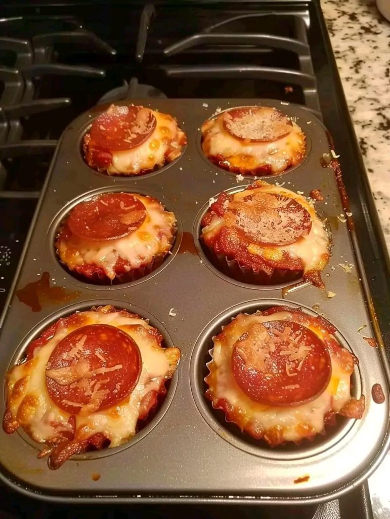 Fill each cup with pizza sauce, cheese blend, and your favorite toppings (plus a pepperoni on top!).