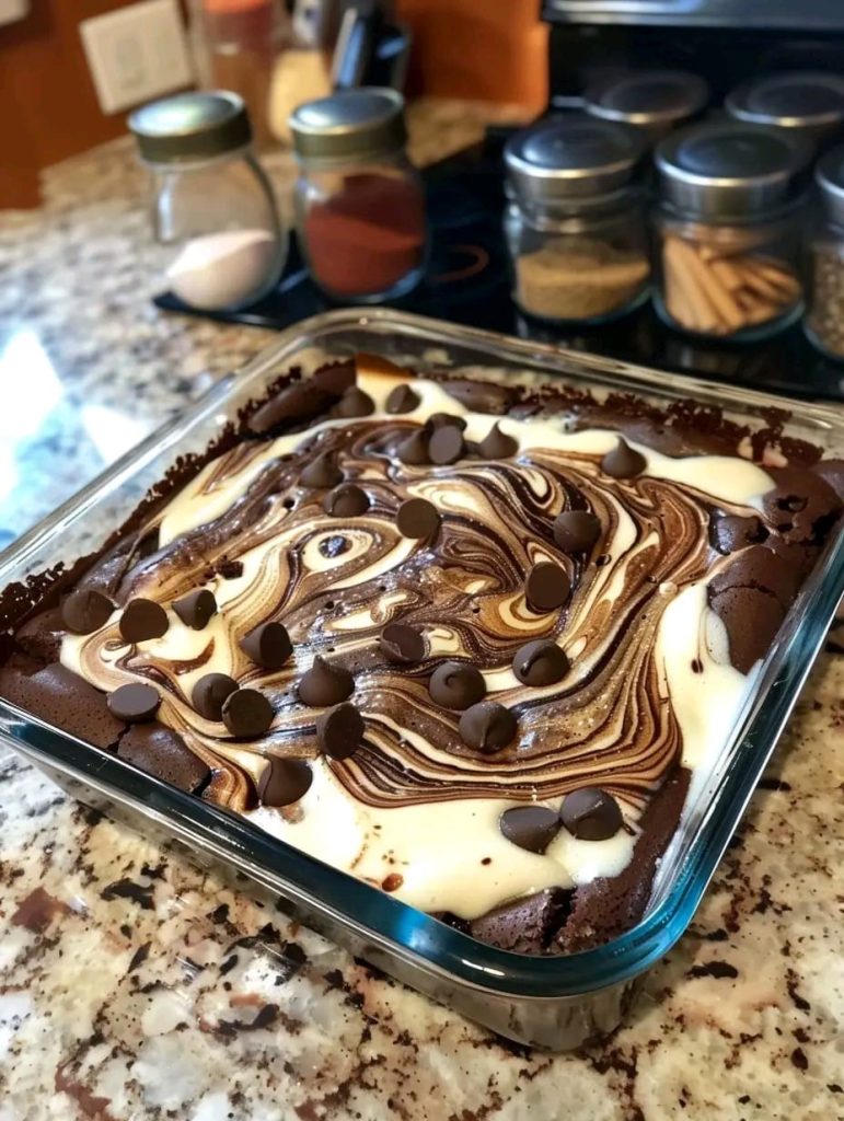 Drop spoonfuls of cheesecake mixture over the brownie base.