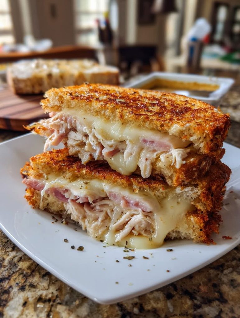 On the unbuttered side of one bread slice, layer one slice of Swiss cheese first (this helps prevent the bread from getting soggy). Add the shredded cooked chicken, spreading it evenly. Layer the turkey ham slices on top of the chicken, then add the second slice of Swiss cheese. Season with salt, black pepper, and garlic powder.