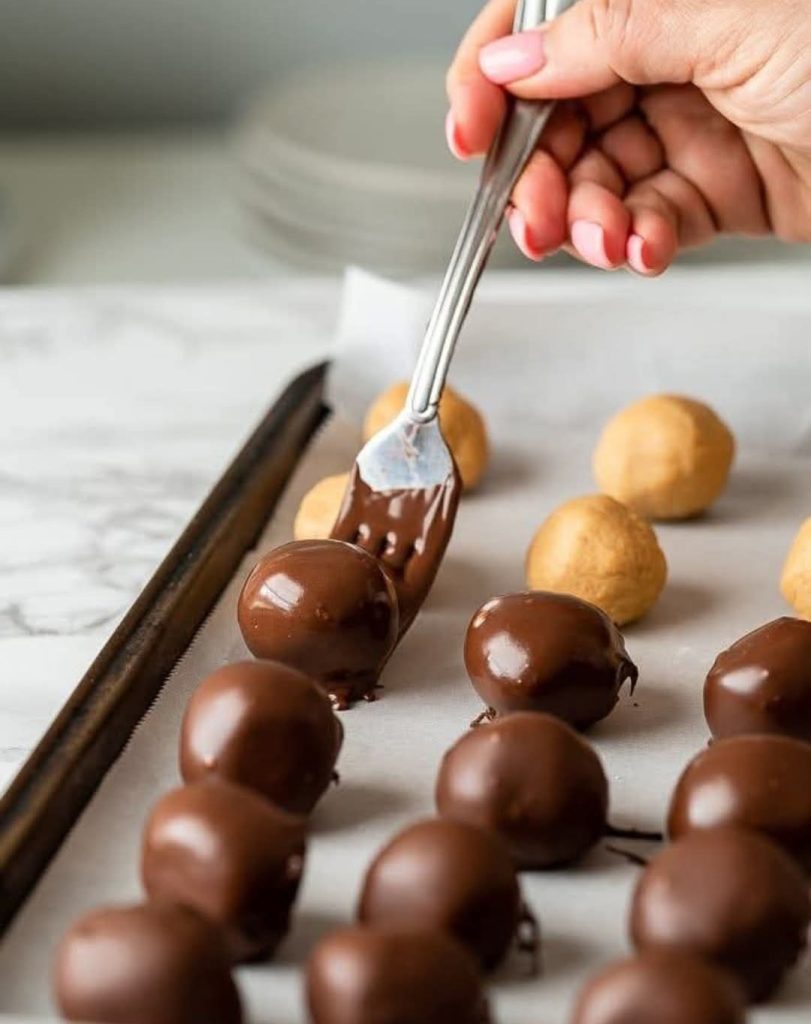 Using a fork or toothpick, dip each peanut butter ball into the melted chocolate, coating evenly. Let any excess drip off.