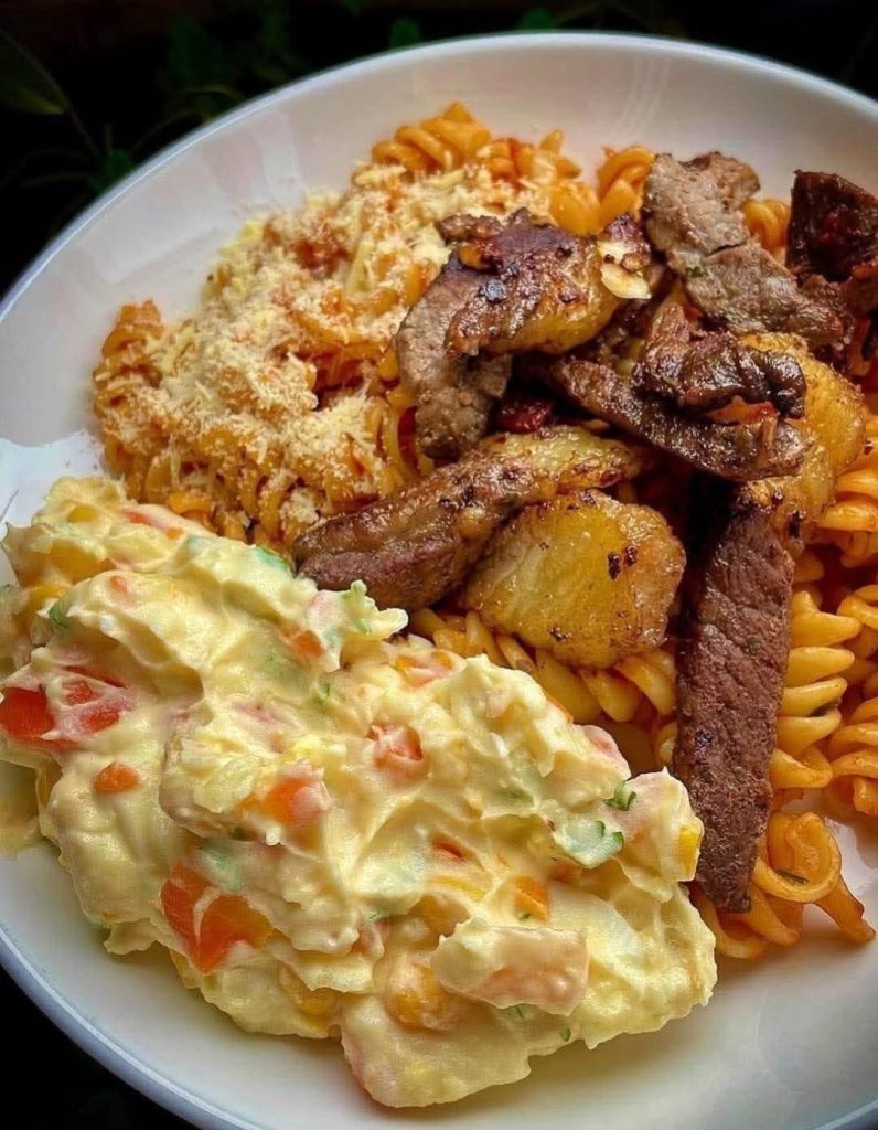 Serve a portion of saucy pasta with grated cheese, add the beef strips on top, and place a scoop of creamy potato salad on the side.