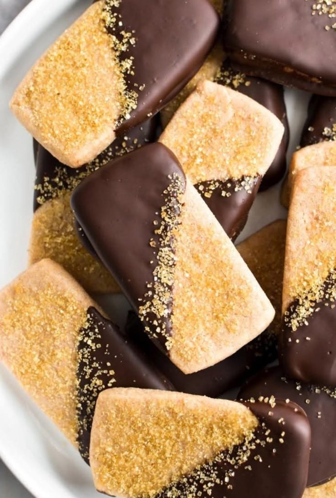 Melt the chocolate over a double boiler or in the microwave in short intervals. Dip one end of each cooled cookie into the melted chocolate, shake off excess, and place on parchment paper. Decorate with sprinkles or nuts if desired. Allow chocolate to set before serving or storing in an airtight container.