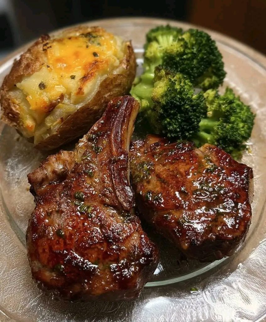 Serve lamb chops with the baked potato and broccoli. Drizzle leftover garlic butter from the pan over the meat for next-level flavor and glossy perfection!