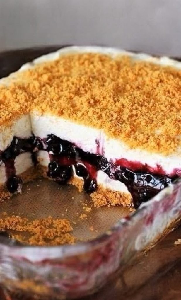 Top blueberry layer with the remaining cream cheese/whipped cream mixture. Gently spread it evenly over the blueberry layer, covering it completely.