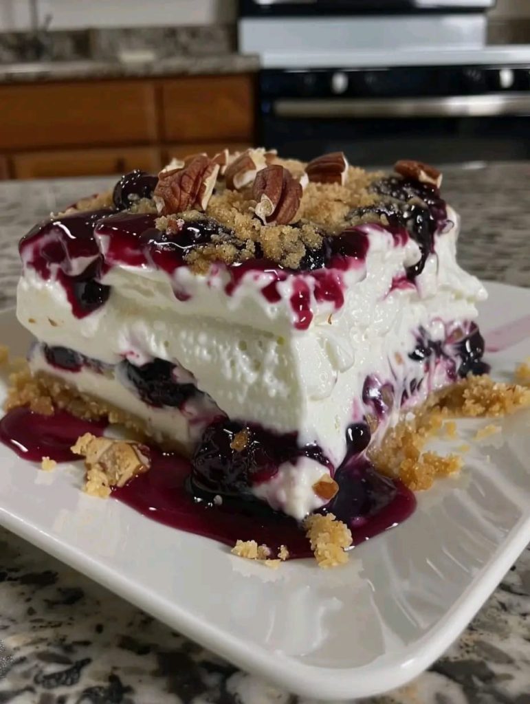 Spread a generous layer of Cool Whip over the blueberry topping and sprinkle with chopped pecans.
