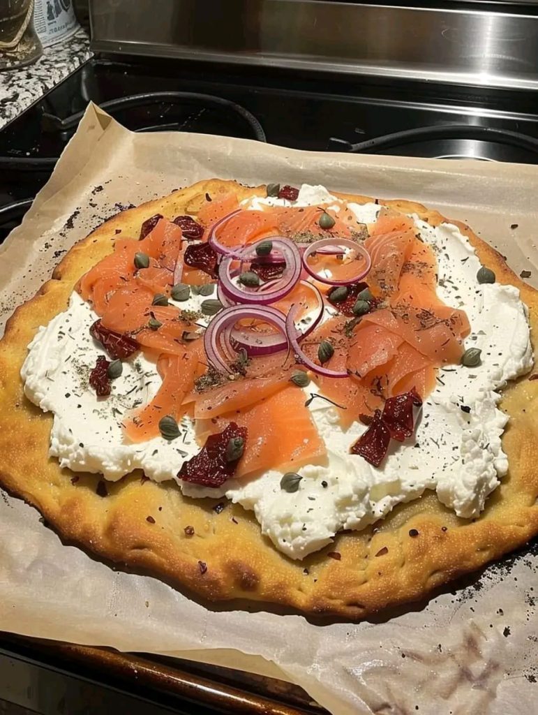 Add smoked salmon, red onion slices, capers, and sun-dried tomatoes on top.