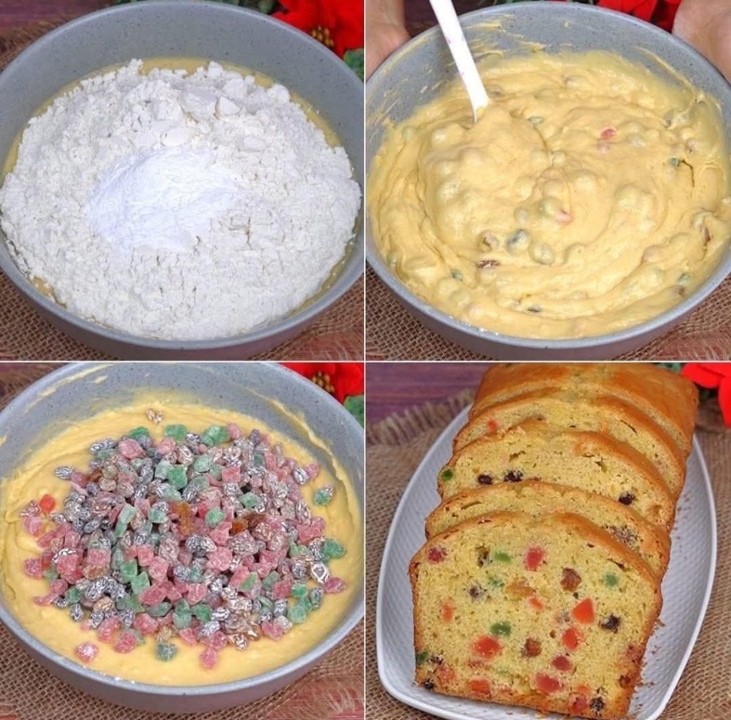 - Mélange les fruits confits et les raisins secs avec 1 cuillère de farine (pour éviter qu’ils tombent au fond).