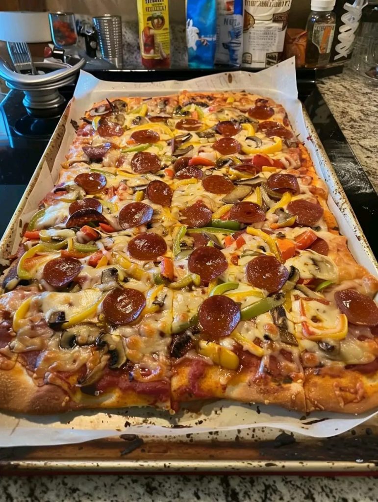 Spread the pizza sauce evenly over the crust. Sprinkle mozzarella on top, then add pepperoni, peppers, mushrooms, and olives.