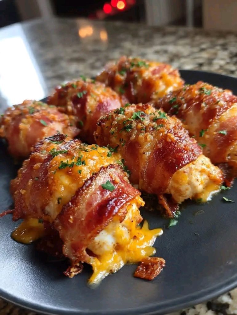 Bake for 25–30 minutes or until chicken is fully cooked (internal temp 165°F / 74°C) and bacon is crispy.