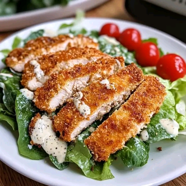 Crisp romaine tossed in rich Caesar dressing, topped with golden fried chicken cutlets, Parmesan cheese, and classic garnishes. Light but satisfying!
