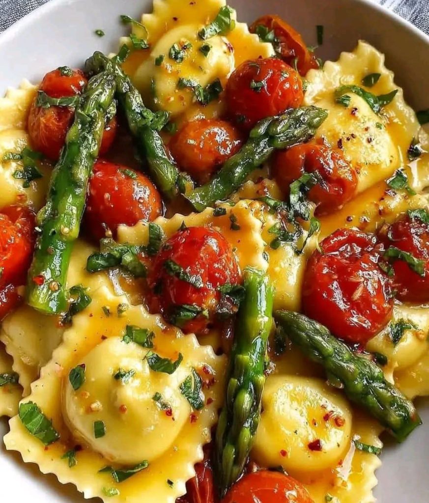 A fresh and comforting pasta dish loaded with juicy tomatoes, tender asparagus, and rich garlic-herb flavors. This recipe brings vibrant spring ingredients together with pillowy ravioli for a quick yet gourmet meal that everyone will love.