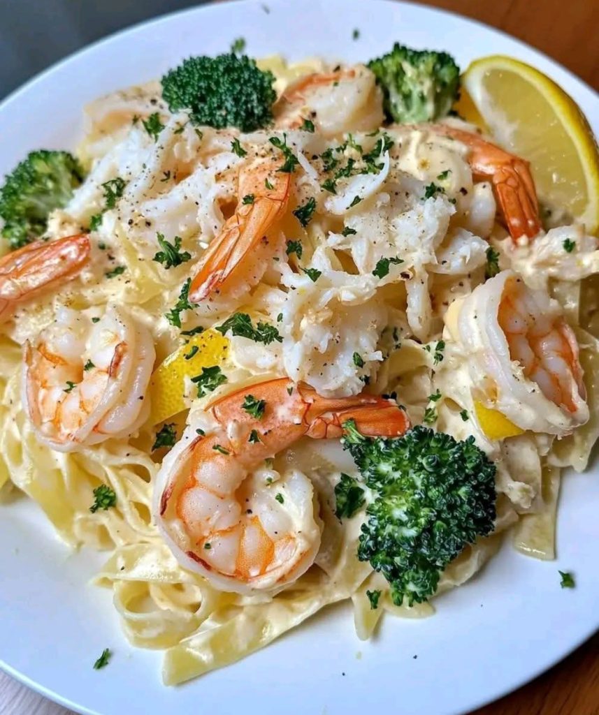 Creamy Shrimp & Crab Alfredo with Broccoli