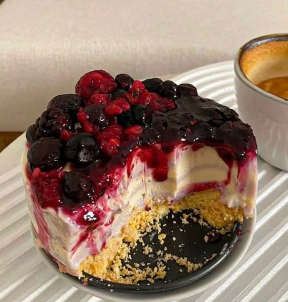 Thick, velvety cheesecake filling… buttery biscuit crust… and that glossy mixed-berry topping dripping down the sides. Pure dessert magic.