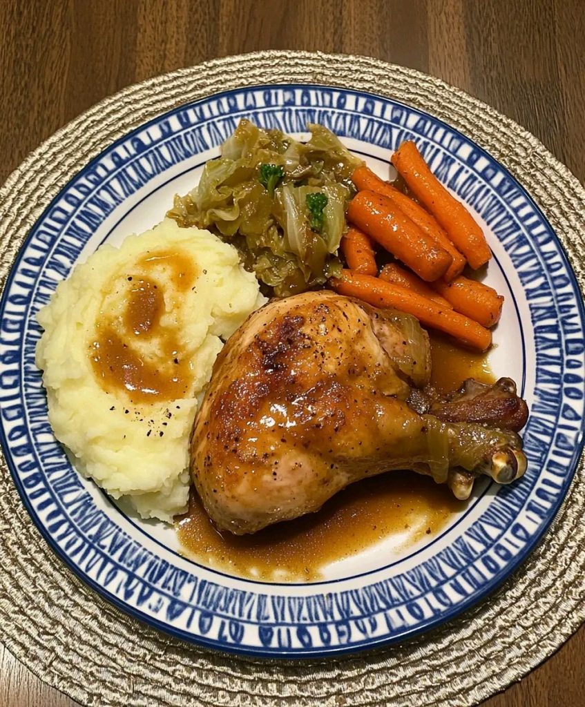 A warm, soul-filling comfort meal featuring juicy herb-roasted chicken, buttery mashed potatoes, tender glazed carrots, and perfectly sautéed cabbage. This dish brings classic Sunday-dinner vibes straight to your table — simple ingredients, big flavors, and a cozy aroma that fills the whole house.