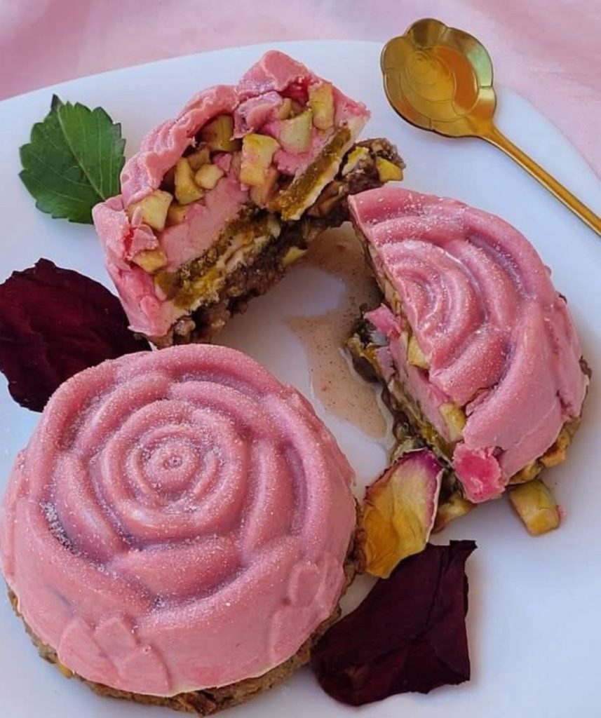 Delicate rose shapes, a soft pink mousse, crunchy nutty base, and a sweet apple filling in the center… it’s like eating a tiny piece of art.