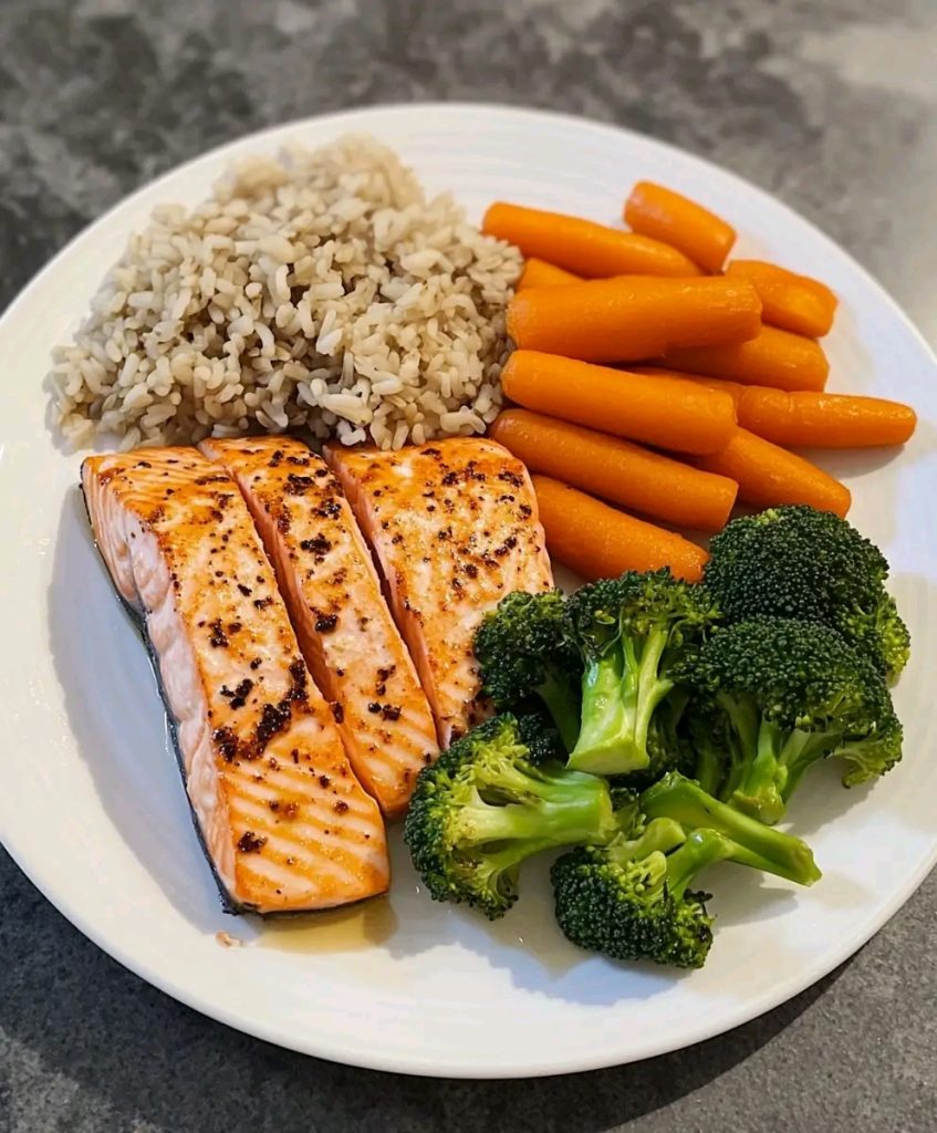 A light and healthy dish featuring pan-seared seasoned salmon served alongside steamed broccoli, sweet baby carrots, and warm brown rice. Perfect for meal prep or a quick balanced dinner.