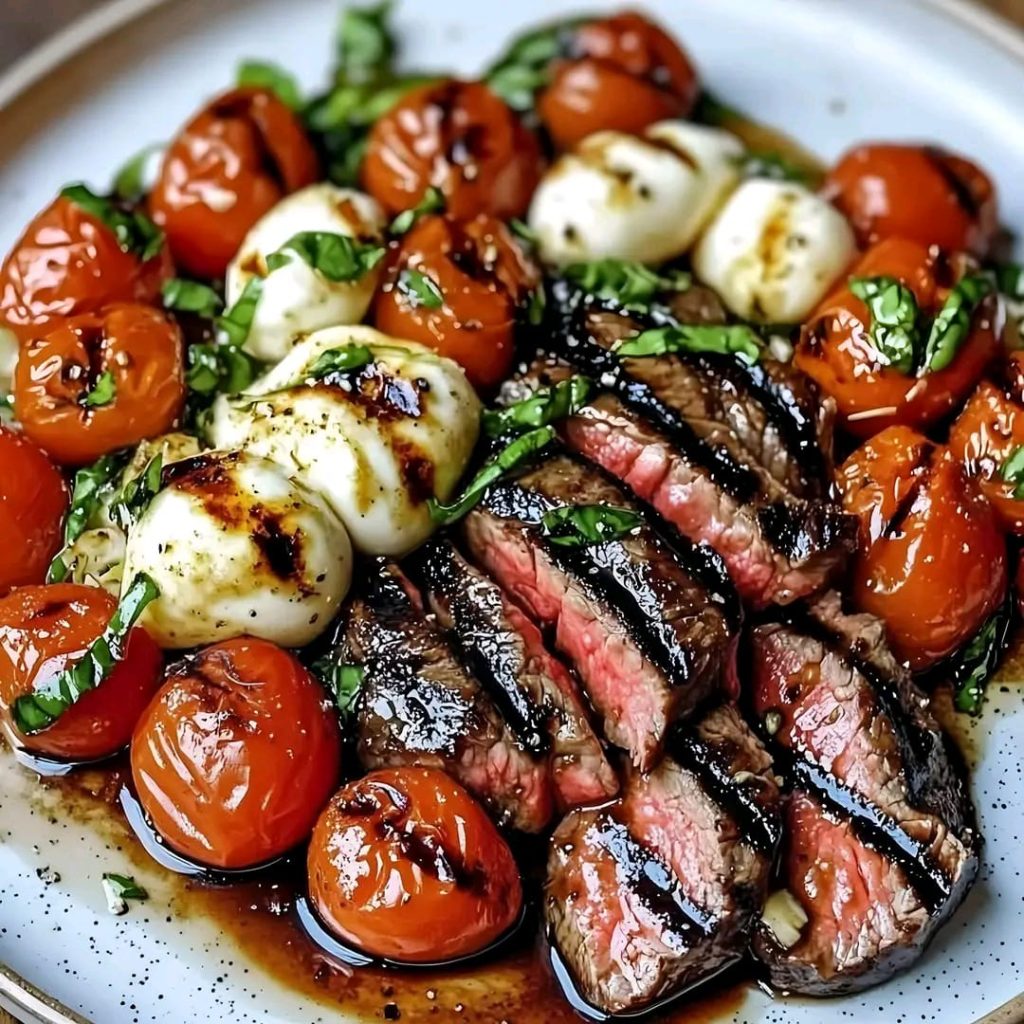 - On a serving platter, arrange the sliced steak, followed by the Caprese salad mixture on top.
