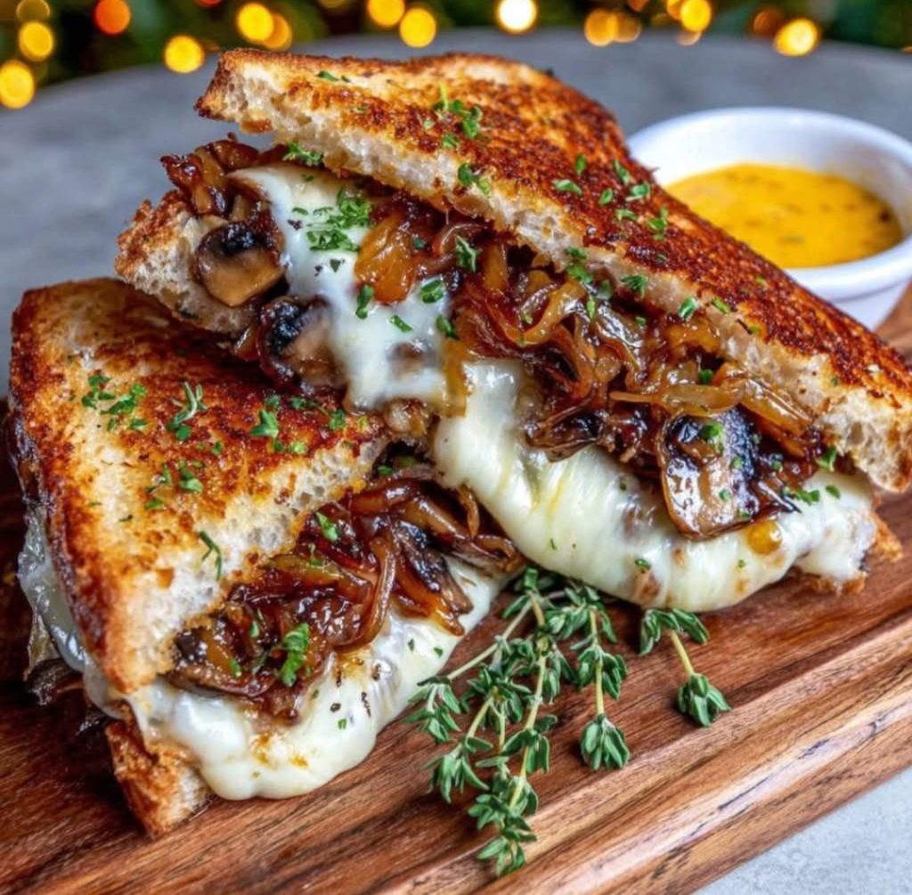 Place sautéed mushroom and onion mixture on two slices of bread (buttered side down). Top with cheese slices, then cover with remaining bread (buttered side up).