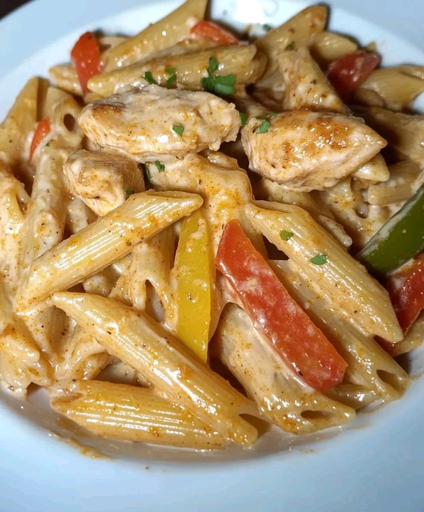 this dish is a rich and spicy creamy Cajun pasta loaded with tender chicken strips, sautéed bell peppers, and perfectly cooked penne—all coated in a velvety, seasoned cream sauce. Comforting, bold, and absolutely irresistible!