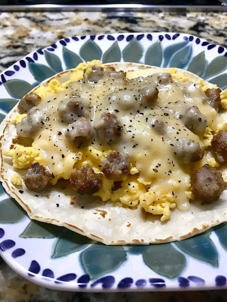Add scrambled eggs on top, then spoon the sausage gravy over them.