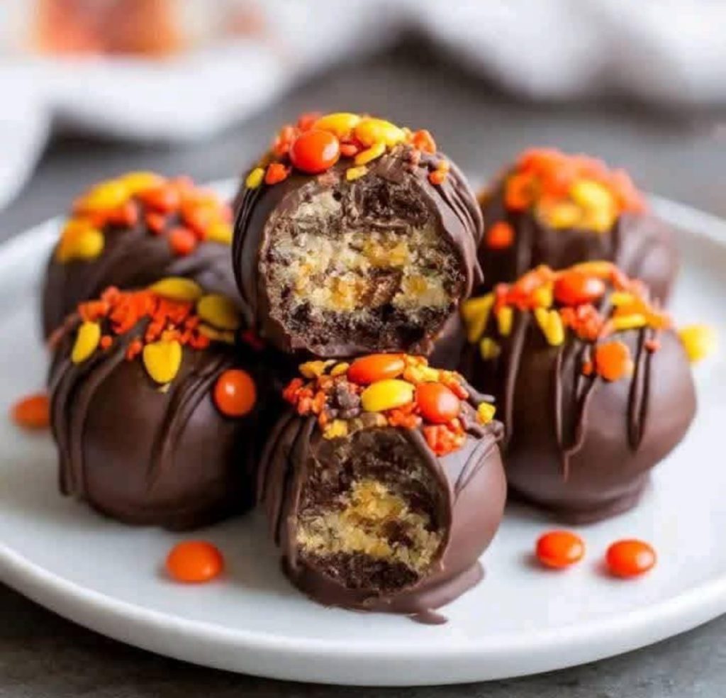 Oreo balls filled with peanut butter cups, dipped in chocolate, and topped with Reese’s pieces!