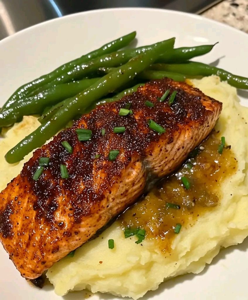 rich blackened salmon paired with velvety mashed potatoes and savory green beans seasoned without pork but still full of flavor.