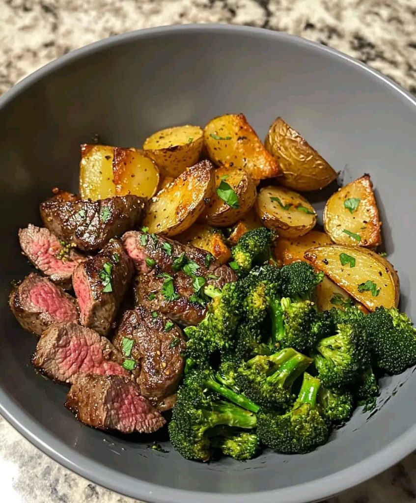 this bowl is simple, wholesome, and packed with flavor. Juicy medium-rare steak bites, golden roasted potatoes, and garlicky charred broccoli come together for a nutrient-dense, satisfying dish that’s perfect any day of the week.