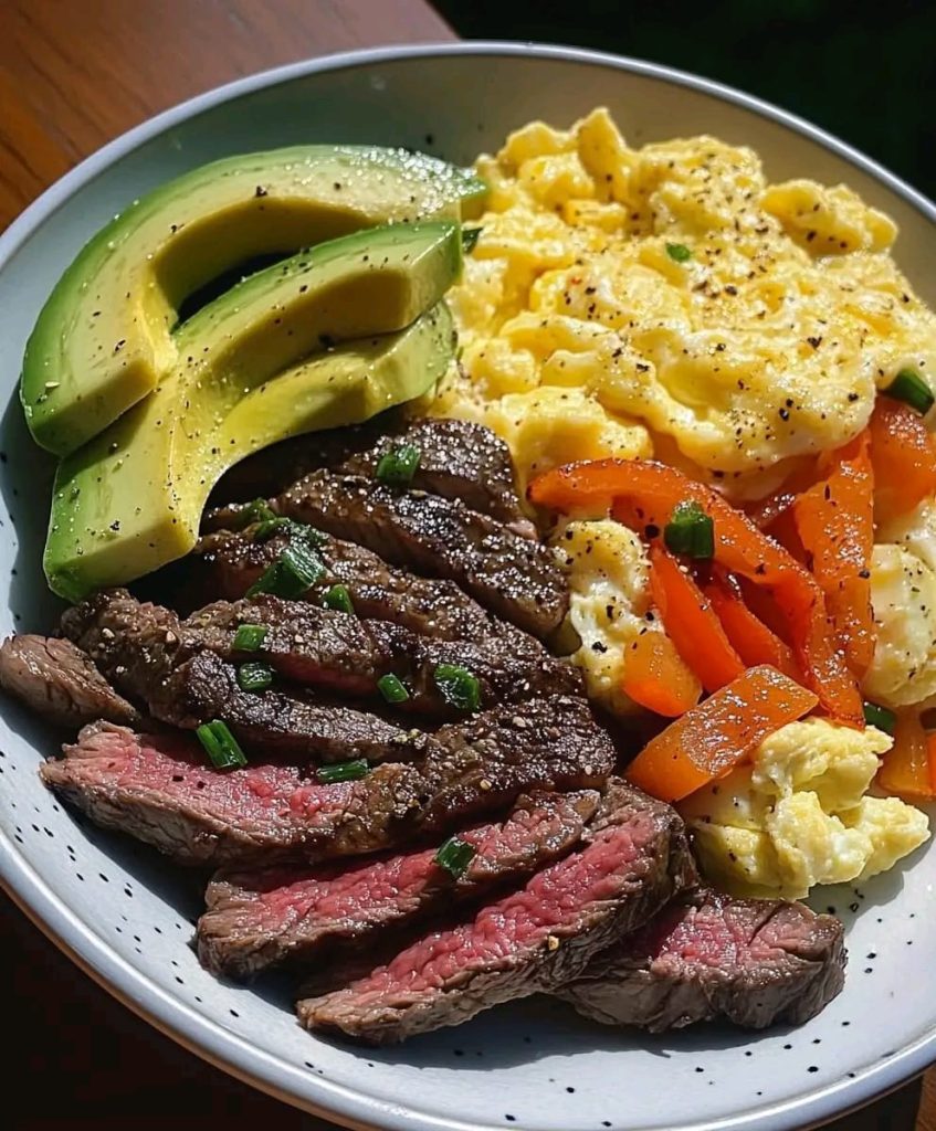 A hearty, low-carb breakfast featuring tender seared steak strips with onions and peppers, soft and fluffy scrambled eggs, and creamy sliced avocado sprinkled with sea salt. Perfect for energy, satisfaction, and clean eating!