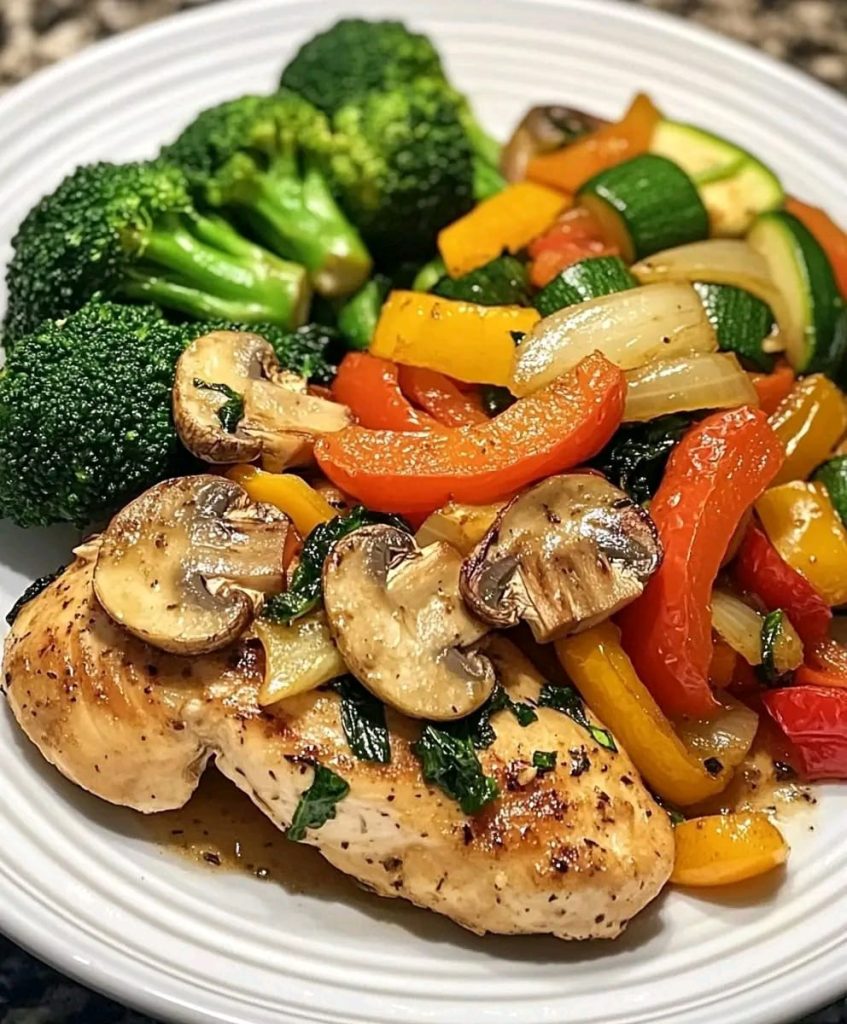 , this dish features juicy pan-seared chicken breast topped with a colorful medley of sautéed peppers, onions, spinach, and mushrooms—served with tender broccoli and lightly browned zucchini. It’s wholesome, lean, and bursting with flavor!