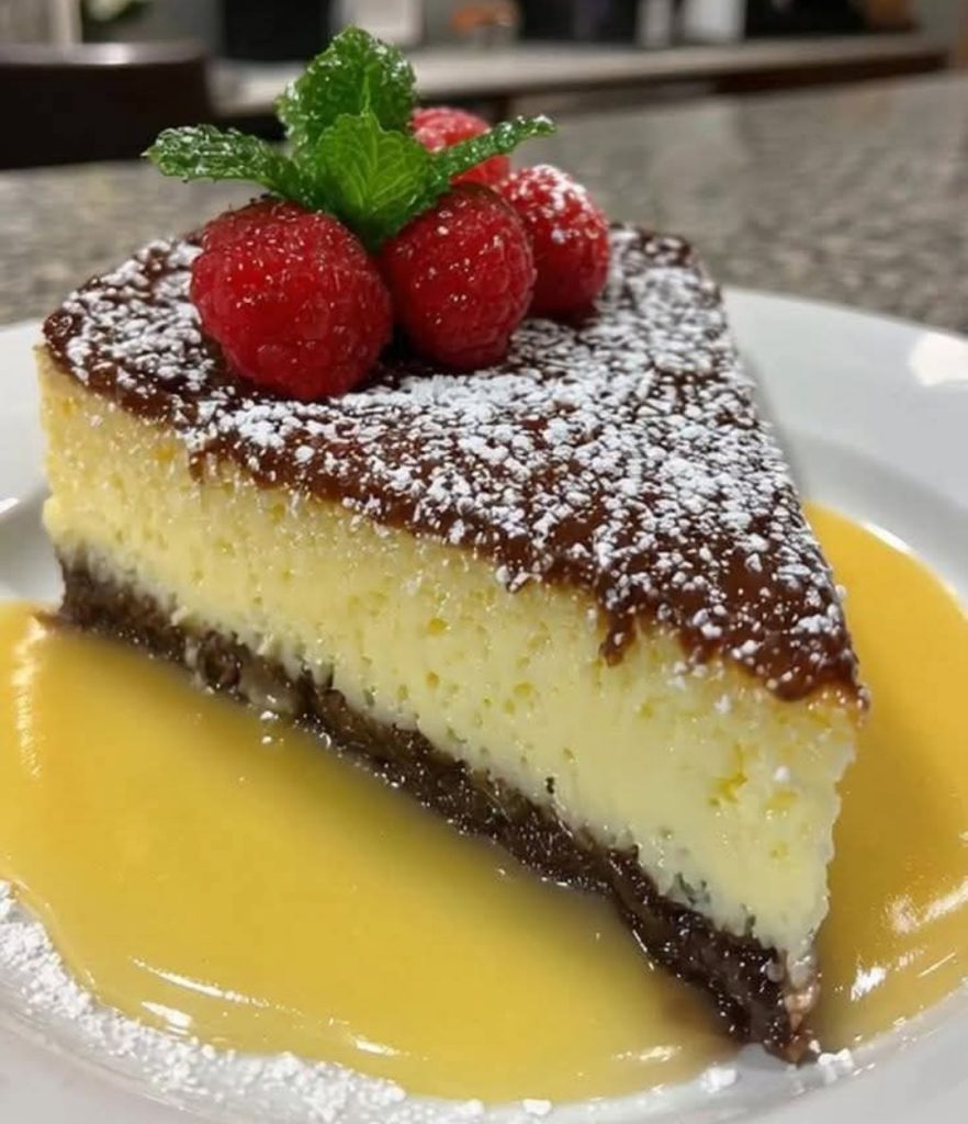 This elegant, silky dessert is what happens when a creamy vanilla custard meets a rich chocolate base and a glossy caramel sauce. Topped with fresh berries and a dusting of powdered sugar, it’s the kind of cheesecake that steals the show at any gathering. Smooth, decadent, and surprisingly simple to make—this one is a keeper!