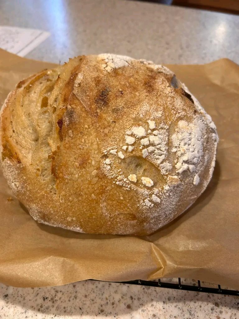 - Score and bake: Gently transfer the dough onto parchment, score the top, and bake covered to trap steam. Remove the lid halfway through to brown the crust.