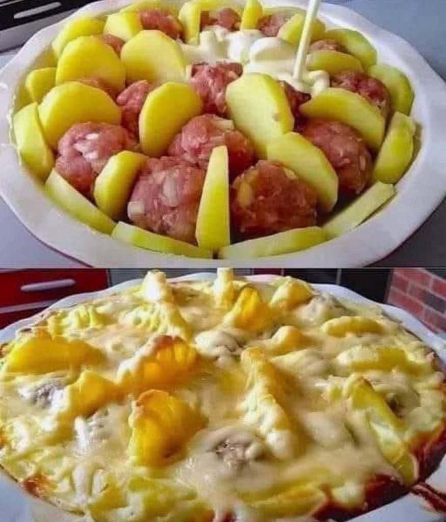 Place the potato slices in an ovenproof dish and make the meatballs. Add to the baking dish as well.