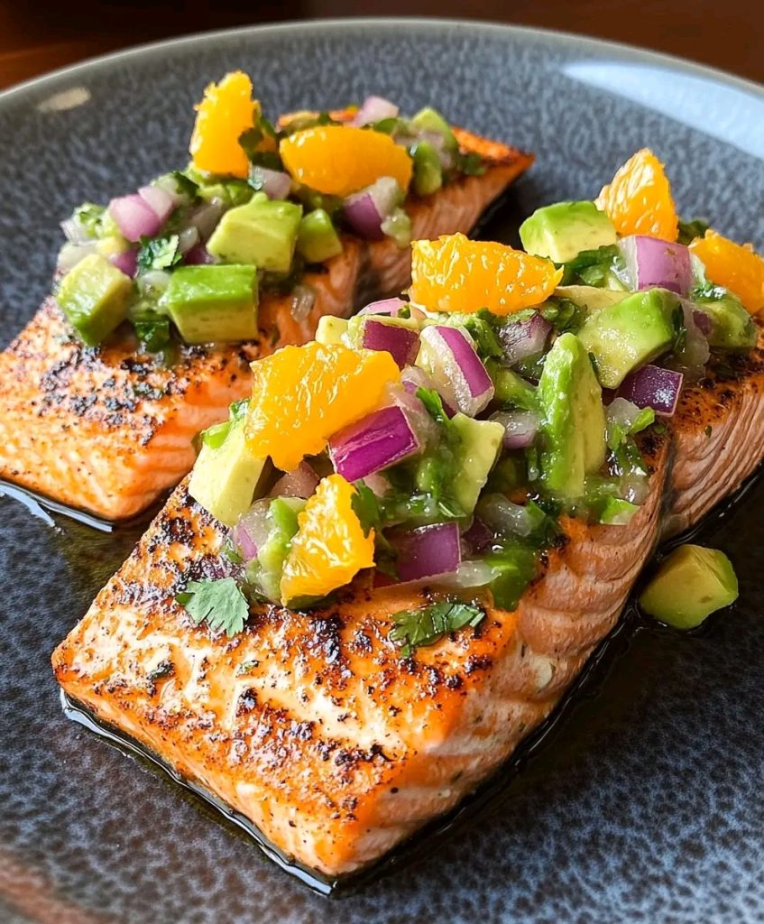 Pan-seared salmon topped with a refreshing avocado–orange salsa — a perfect balance of richness, freshness, and sweetness.