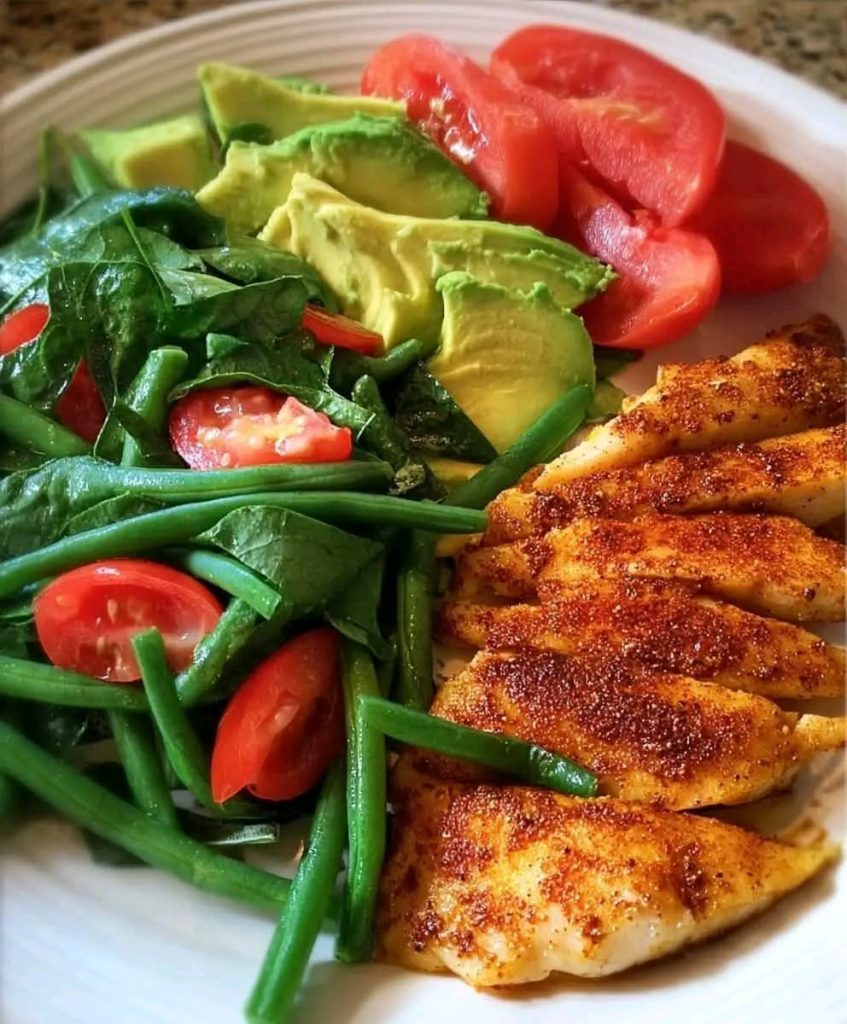 Light, colorful, and loaded with fresh textures — this dish combines tender chili-seasoned tilapia with creamy avocado, crisp green beans, and a juicy tomato–spinach salad. A simple, clean meal perfect for a healthy lunch or dinner!