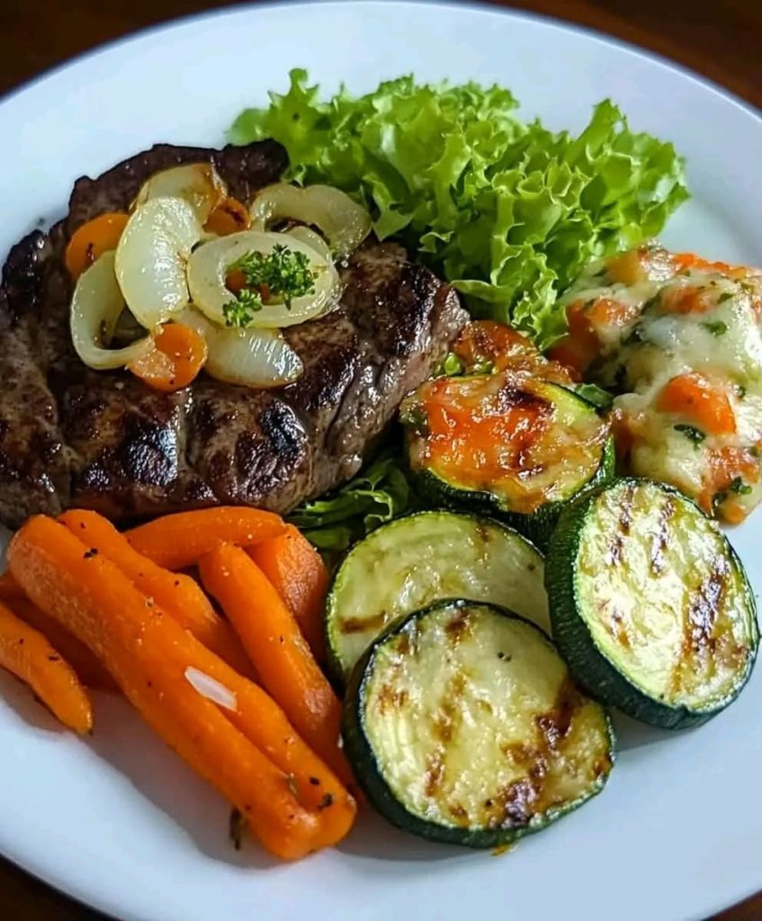 A hearty, colorful, and satisfying plate! Tender steak topped with sweet sautéed onions, a medley of soft carrots and zucchini, fresh lettuce, and rich cheesy zucchini slices baked to perfection.