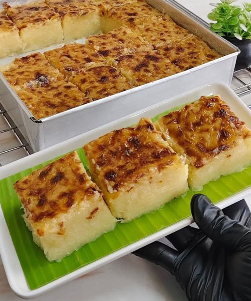 Grease the baking pan with butter, pour in the cassava mixture. Bake for 50-1 hour 200°C or until the top is firm and lightly golden. Remove from oven and spread the topping mixture evenly over the surface. Sprinkle the grated cheese on top. Return to the oven and bake for another 20-25 minutes or until the topping is bubbly.