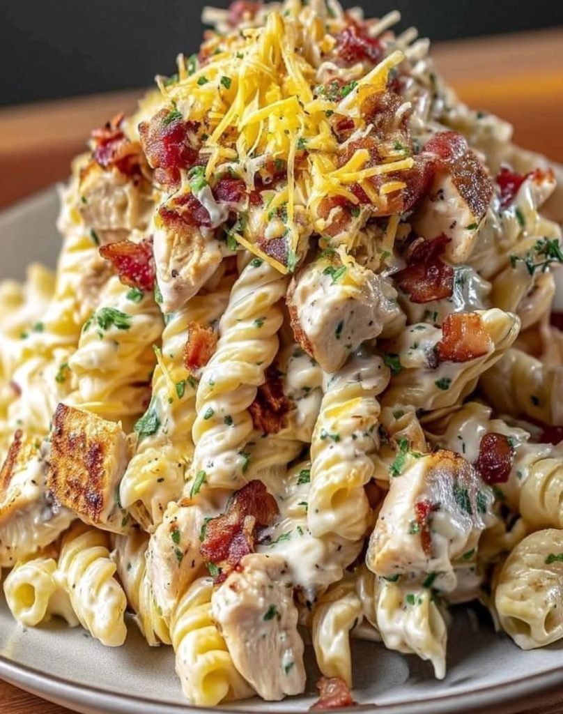 7.2. Serve hot and enjoy your creamy Chicken Bacon Ranch Pasta!