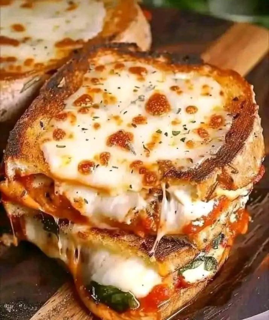 - Layer the shredded chicken over the sauce on one slice of bread.