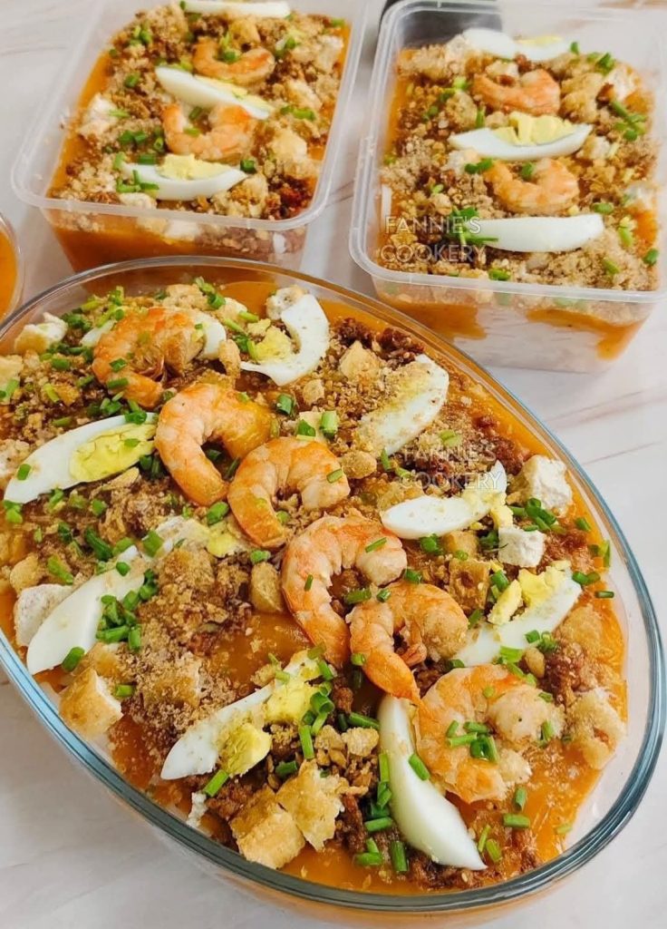 Add water and bring to a boil. Add atsuete powder, fish sauce depending on taste. Season with pepper and pork broth cube. Bring to a boil. When it boils, reduce heat and pour in slurry mixture while stirring constantly. Add 3 tbsp crushed chicharon. Stir and cook for a minute. Sprinkle with spring onions, tinapa powder and salt. Stir and simmer until the sauce has really thickened and well-cooked.