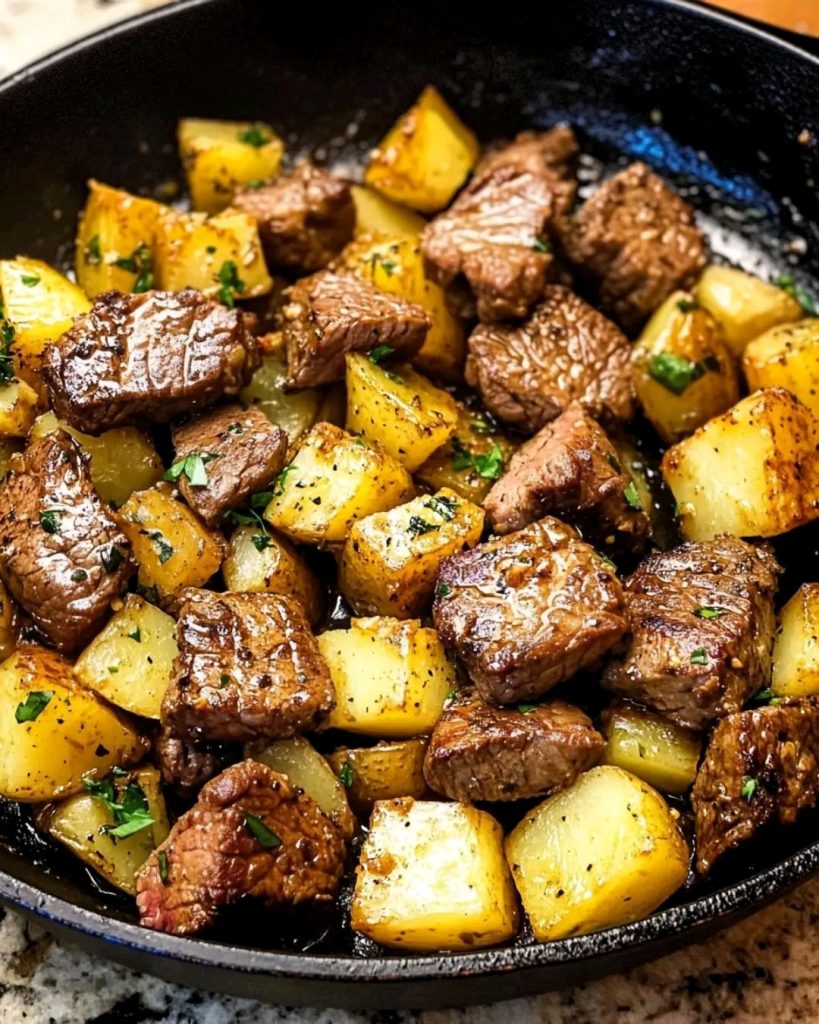 Return the skillet to high heat, add the remaining 2 tablespoons of butter, and let it melt. Add steak cubes in a single layer and sear for 1 minute. Stir or flip, then cook an additional 1–2 minutes until the steak reaches desired doneness.