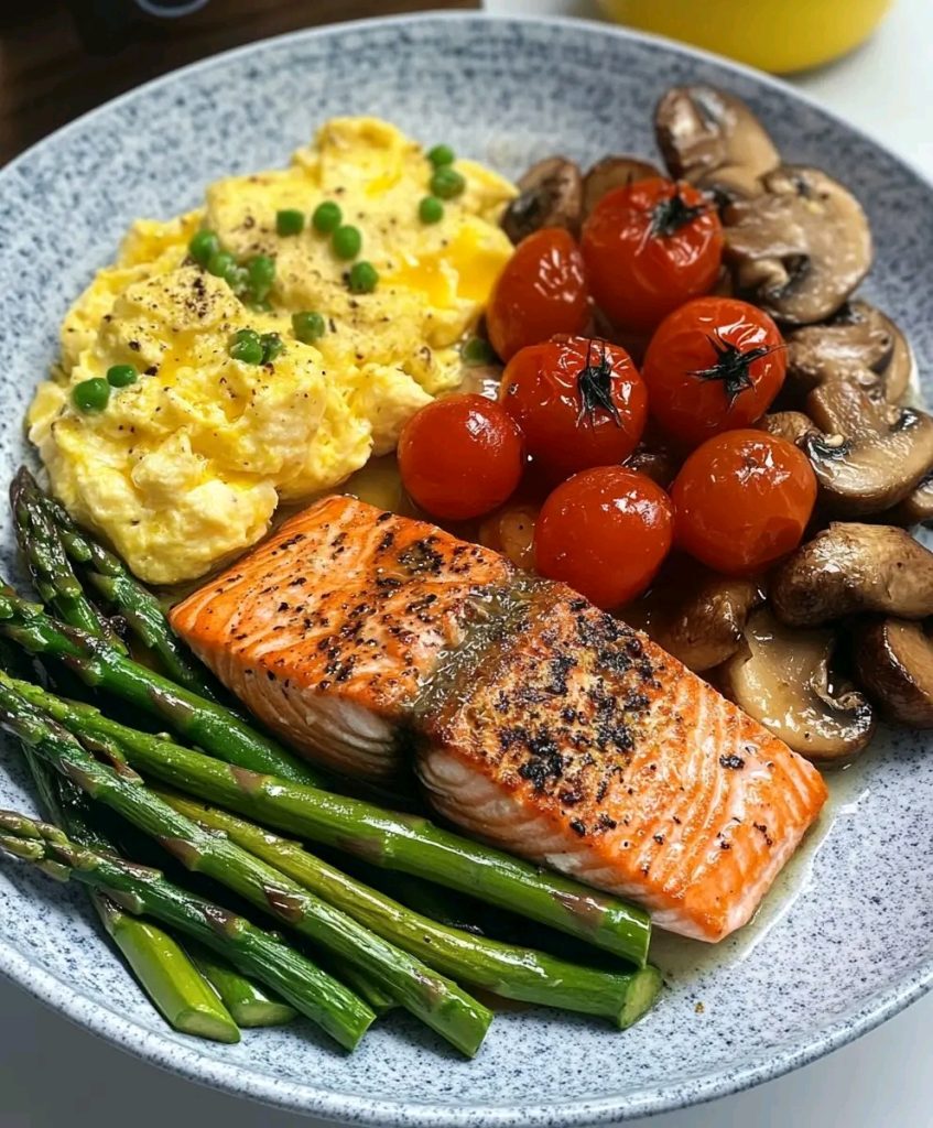 A vibrant, protein-packed plate featuring pan-seared salmon, garlicky asparagus, blistered tomatoes, juicy sautéed mushrooms, and fluffy scrambled eggs. A clean, nourishing meal that’s perfect for lunch, dinner, or even a hearty breakfast!