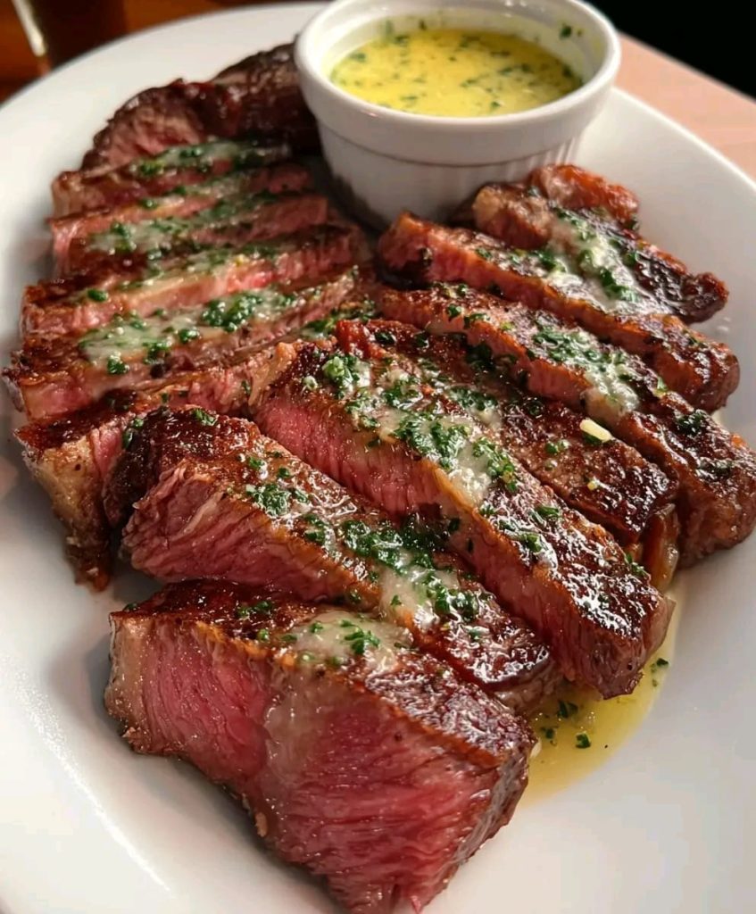 This stunning plate features a juicy, perfectly medium-rare ribeye, sliced and fanned out just like at a high-end steakhouse. Itβs served with a rich, velvety garlic-herb compound butter that melts into every bite. Simple ingredients β elite results.