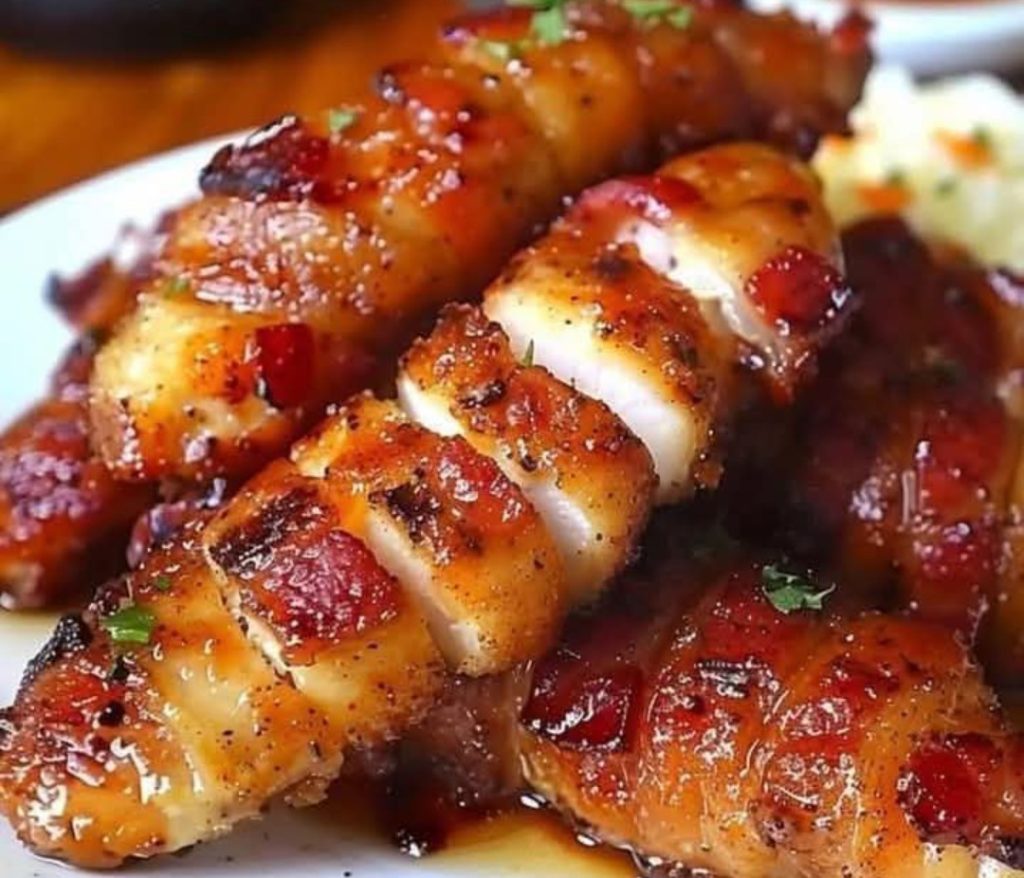 Wrap each chicken tender with one slice of bacon, securing the ends underneath.