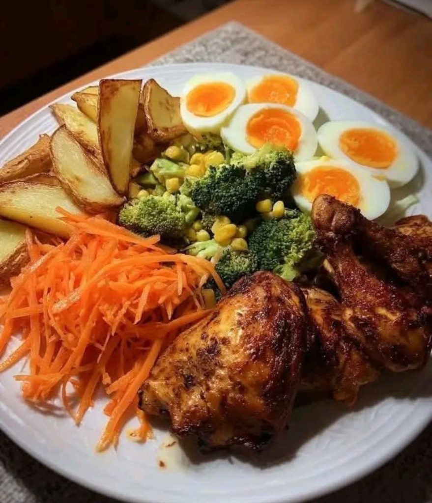 A simple, colorful, and nutrient-packed meal featuring crispy roasted chicken, tender potatoes, fresh carrot slaw, perfectly cooked broccoli, and protein-rich boiled eggs. Balanced, satisfying, and great for everyday healthy eating!
