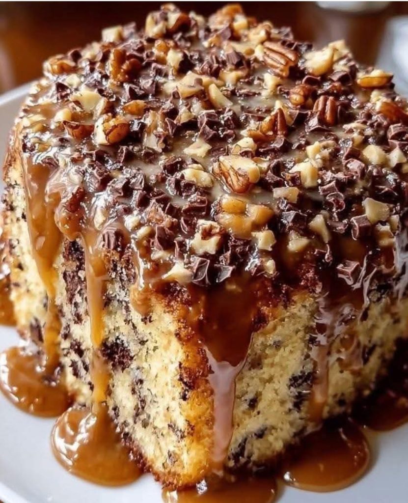 Now the magic begins. Warm caramel flows slowly over the top, dripping down the sides in glossy ribbons. A shower of chopped pecans and extra chocolate lands over the warm caramel, sticking beautifully and creating that indulgent, crunchy crown you see in the photo.