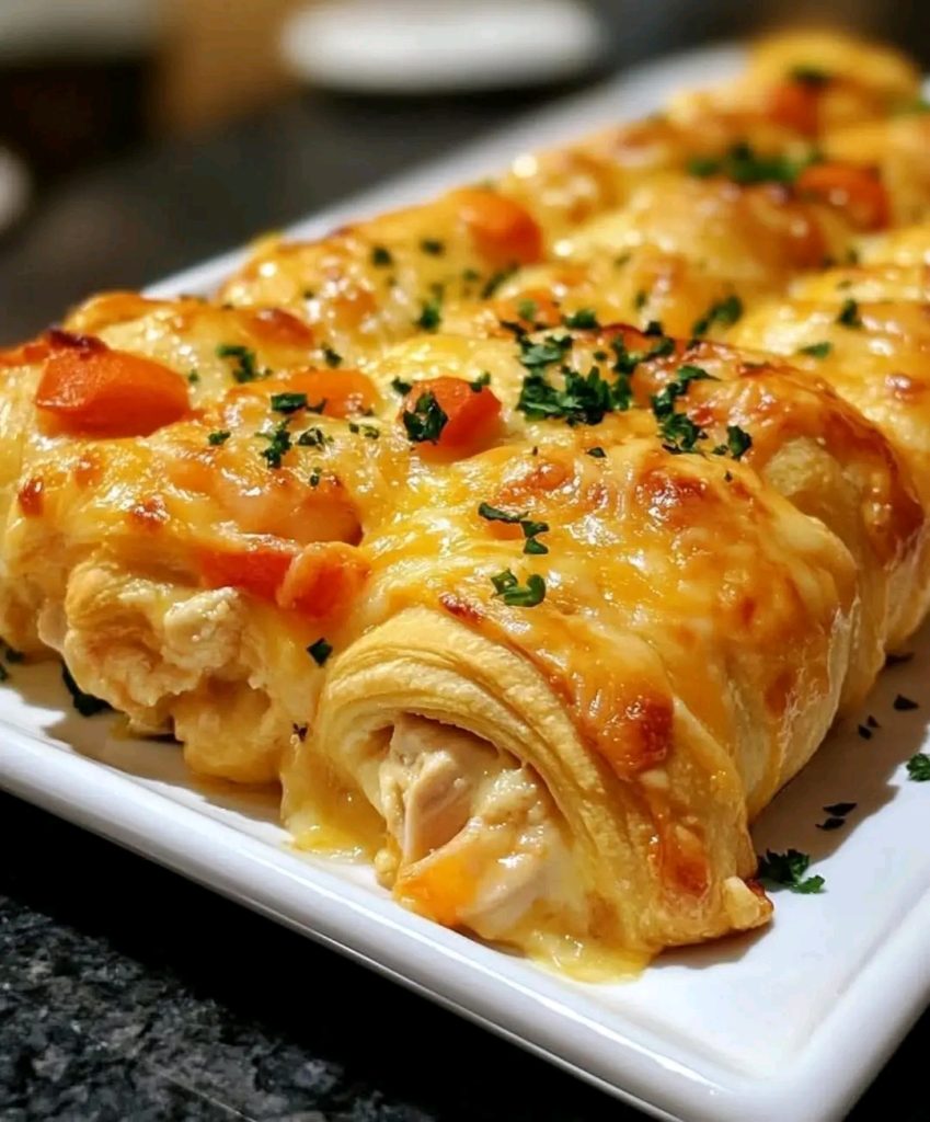 - Bake for 30-35 minutes, or until the chicken is cooked through and the crescent roll dough is golden brown and flaky. (30-35 minutes)
