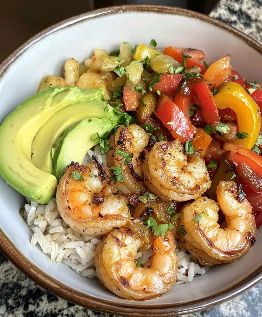 This bowl is vibrant, savory, and incredibly satisfying! Juicy garlic-butter shrimp, creamy avocado slices, fluffy seasoned rice, and sweet caramelized peppers come together for a balanced, restaurant-style meal you can make at home in under 30 minutes.